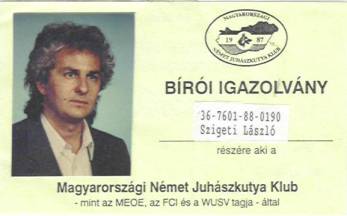 Szigeti Lászlónak hívnak, 1977 óta foglalkozom német juhászkutyákkal. 1983-ban alapítottam a Viernheimi kennelt. 1986-ban lettem aranykoszorús mestertenyésztő. 1992-ben tettem le a bírói vizsgát ez óta tevékenykedem küllembíróként és kőrungmesterként. 1998-ban megjelent az Őfelsége a német juhászkutya cimű könyvem. Kiemelkedő eredményt ért el tenyészetemből Viernheimi Ottis mely 4x lett kiválasztott kitűnő és 1993-ban az Európa kiállításon munka osztályban első lett. Viernheimi Delon az 1996 évi Világkiállításon nyílt osztályban első lett. Viernheimi Vanda 1999-ben a német főtenyésszemlén kitűnő 15. lett (361 nevezőből). A Viernheimi tenyészet 1999-ben a német főtenyésszemlén (Sieger) 50 nevezett tenyészcsoport közül 21. lett, a Világon egyedülállóan mind az öt kutya munkaosztályban szerepelt és mind megkapta a kitűnő minősitést. Vanda 15, Nathali 109, Hetti 110, Ottis 111, Eiko 125. (szukáknál 361, kanoknál 406 nevezőből) . Tenyészetem a Magyar főtenyésszemléken az elmúlt tíz évben kilencszer volt tenyészcsoport győztes, kilenc német SV bírónál.